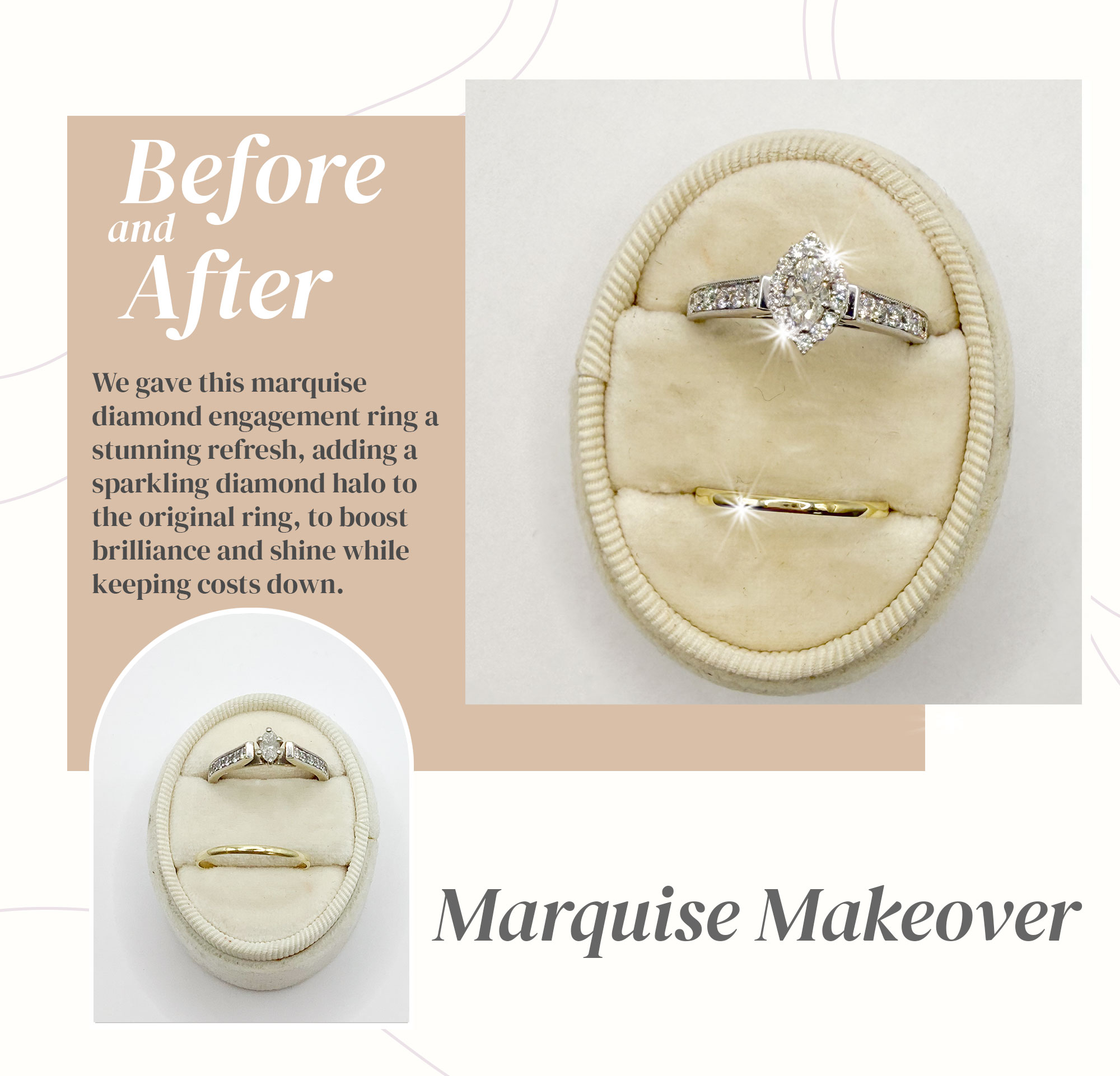 We gave this marquise diamond engagement ring a stunning refresh—adding a sparkling diamond halo to the original ring, to boost brilliance and shine while maintaining the upgrade within the clients specified budget. The ring was thoroughly cleaned and inspected, the prongs were tightened for security, it had a deep steam cleaning and polishing, and finished with a fresh layer of bright white rhodium for that like-new glow. It’s shining brighter than ever and the client is thrilled with the elegant, cost effective, upgrade of her beloved ring.