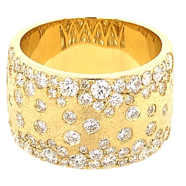 Diamond Scattered 12.3MM Wide Flush Set Cigar Ring Satin Finish Product Information Diamond Scattered Flush Set Cigar Ring Metal: 18K Green Gold Approximate Total Gem Weight: Diamond 1.54 CTS